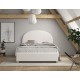 Moon er en polstret seng i størrelsen 140 × 200 cm med bouclé-betræk i hvid, der giver soveværelset et varmt og indbydende udtryk. Den bløde polstring og det afrundede sengegærde skaber en hyggelig, romantisk stemning. Under sengen får du ekstra opbevaringsplads, som nemt nås ved at løfte lamelbunden og madrassen med et praktisk bånd – ideelt til sengetøj og tæpper.