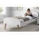 Kiddy sengen i størrelsen 90 × 200 cm giver et roligt og hyggeligt udtryk på børneværelset. De bløde, afrundede gavle, den bløde hvide farve og de lyse ben i massivt træ skaber en varm og indbydende atmosfære, der gør sovetiden tryg og behagelig.