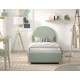 Moon er en polstret seng med opbevaring i størrelsen 90 x 200 cm, der kombinerer praktisk funktion med blød komfort. Den grønne bouclé giver et varmt og hyggeligt udtryk, mens den afrundede gavl skaber en rolig ramme i børne- eller gæsteværelset. Under madrassen findes ekstra opbevaringsplads til sengetøj og tekstiler. Lamelbunden og madrassen løftes nemt ved hjælp af et bånd.