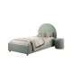 Den matchende grønne puf er et dekorativt blikfang. Den kan bruges som ekstra siddeplads, fodskammel eller som et trendy natbord ved siden af sengen, så bog og telefon altid er inden for rækkevidde. Kombinationen af den bløde polstring, afrundet sengegavl og dæmpede pasteltoner gør sættet ideelt til soveværelset, gæsteværelset eller et hyggeligt læsehjørne.
