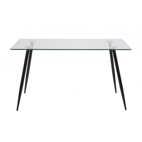 Elegant spisebord i moderne high tech design med 10 mm tyk bordplade i glas monteret på slanke skrå ben i sort metal.
