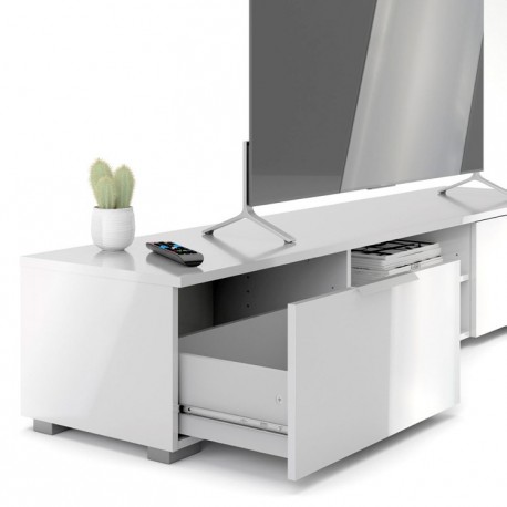 Elegant tv-bord i hvid højglans med 2 rummelige skuffer og metalgreb samt alu-grå ben.