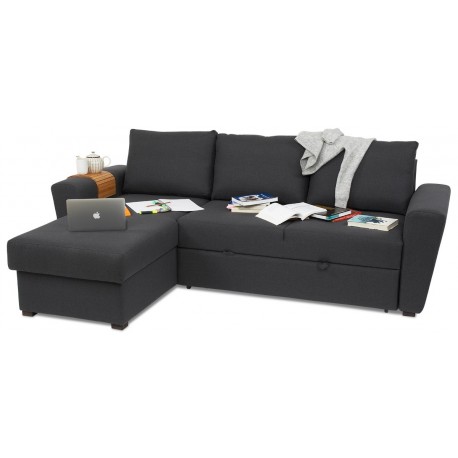 Denne sovesofa er yderst velegnet til dagligt da sofaens madrasopbygning er på højde med en god boxmadras, hvilket giver en optimal liggekomfort. Sofaen indeholder et rummeligt magasin i chaiselongdelen og udtræksfunktion som forvandler sofaen til en bekvemmelig soveplads for 2. Sofaen der med sine skråne armlæn og enkle design, egner sig særlig godt til mindre lejligheder hvor pladsen er trang. Studio sovesofaen har løse ryghynder og en medium/hård siddekomfort. Sofaen er betrukket et slidstærkt strukturvævet mørkegråt møbeltekstil.