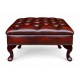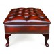 Det er en klassisk, elegant fodskammel eller puf i et traditionelt design. Den er betrukket med mørkerødt læder med en dyb, varm glød, som giver et eksklusivt og tidløst udtryk. Sædet har en karakteristisk knap-polstring (chesterfield-stil), hvor læderet er trukket ned i et mønster af bløde fordybninger.